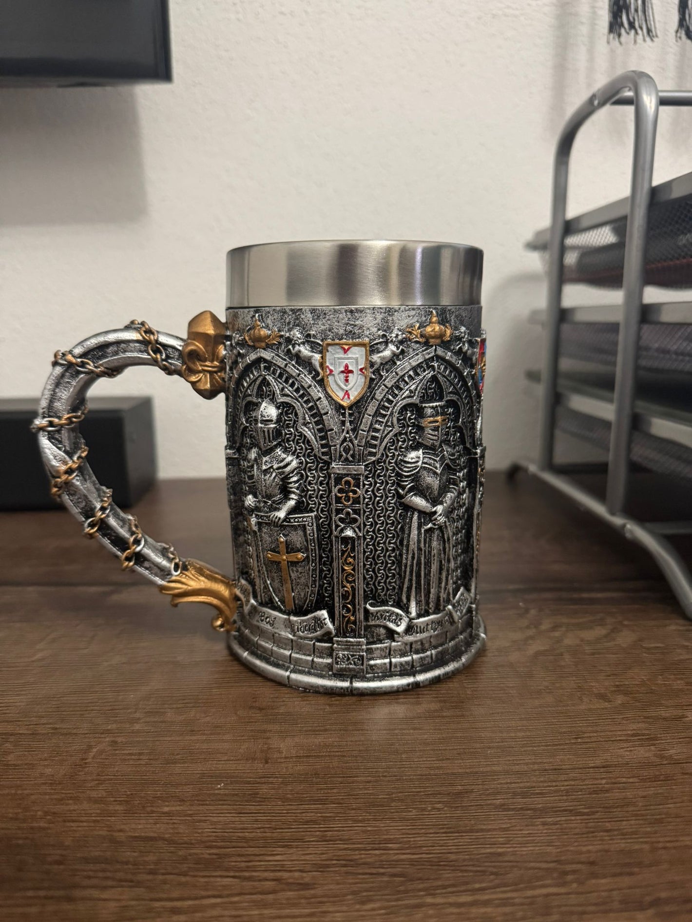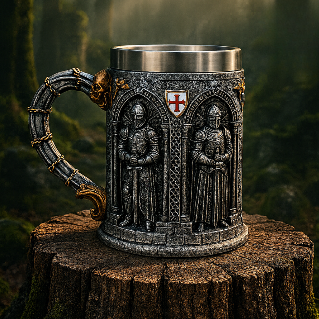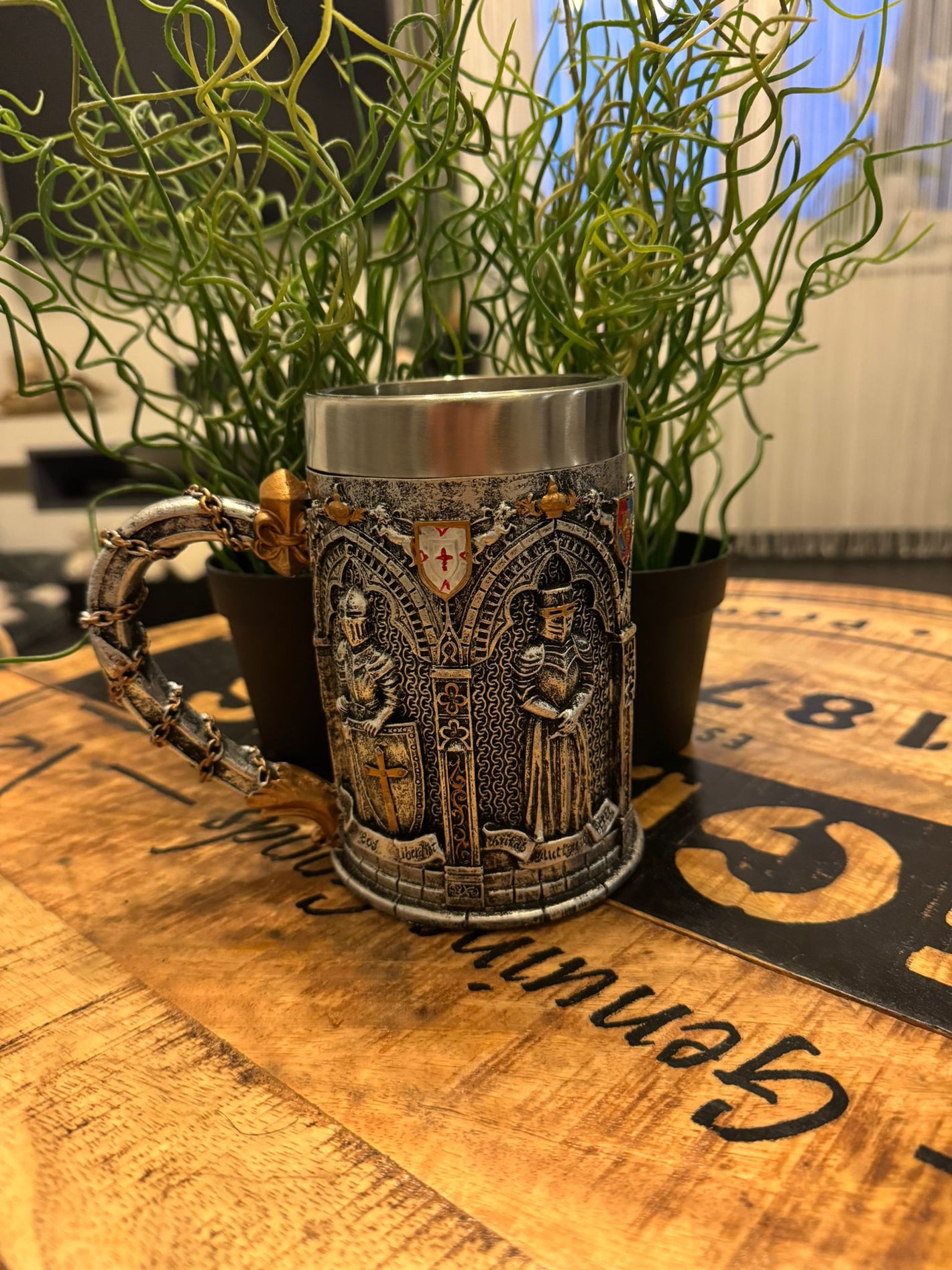 Diese Tasse kombiniert hochwertiges Harz mit einem herausnehmbaren Edelstahleinsatz. Sein mittelalterliches Design und die liebevollen Details machen ihn zum perfekten Geschenk oder Sammlerstück.