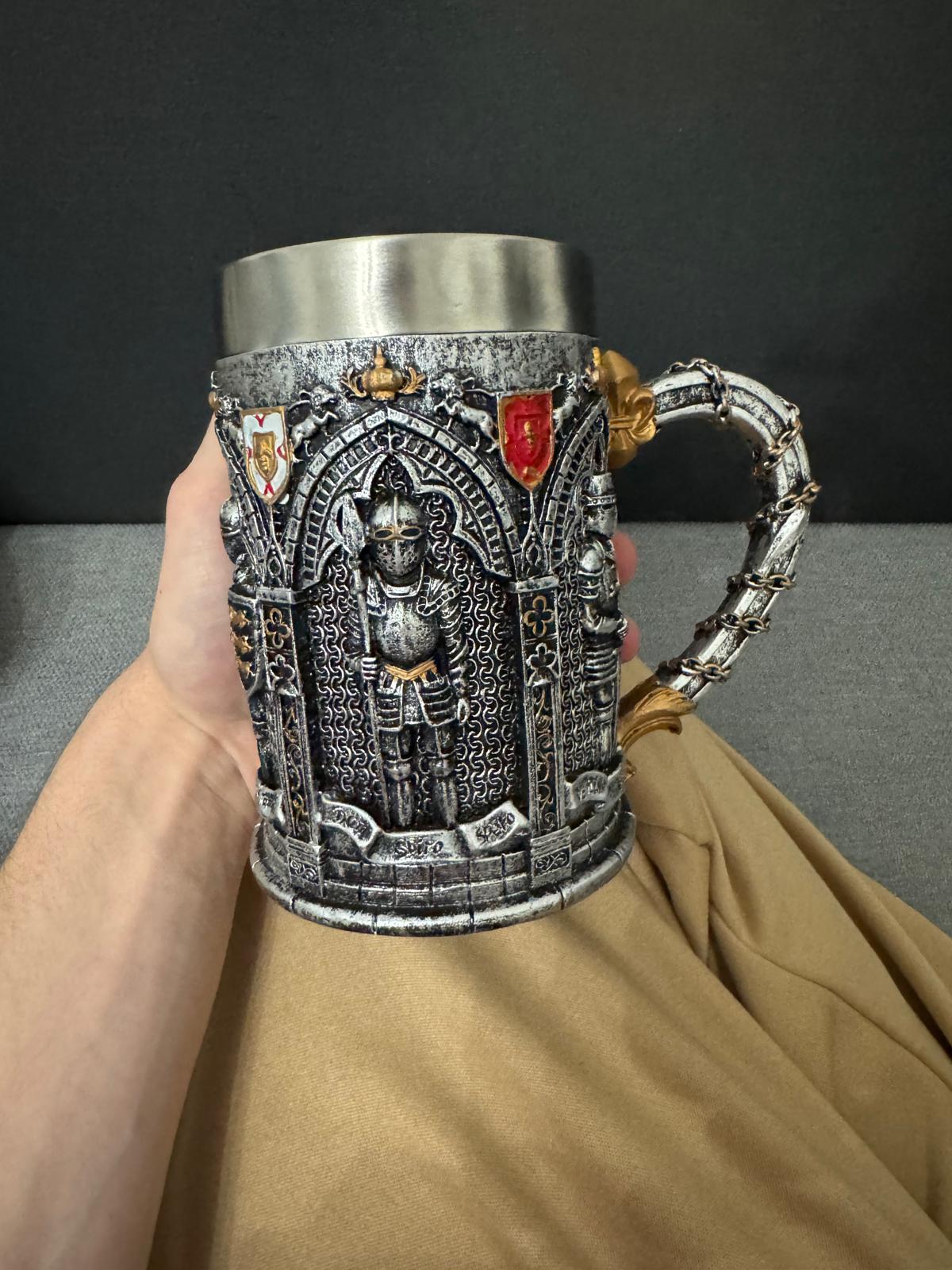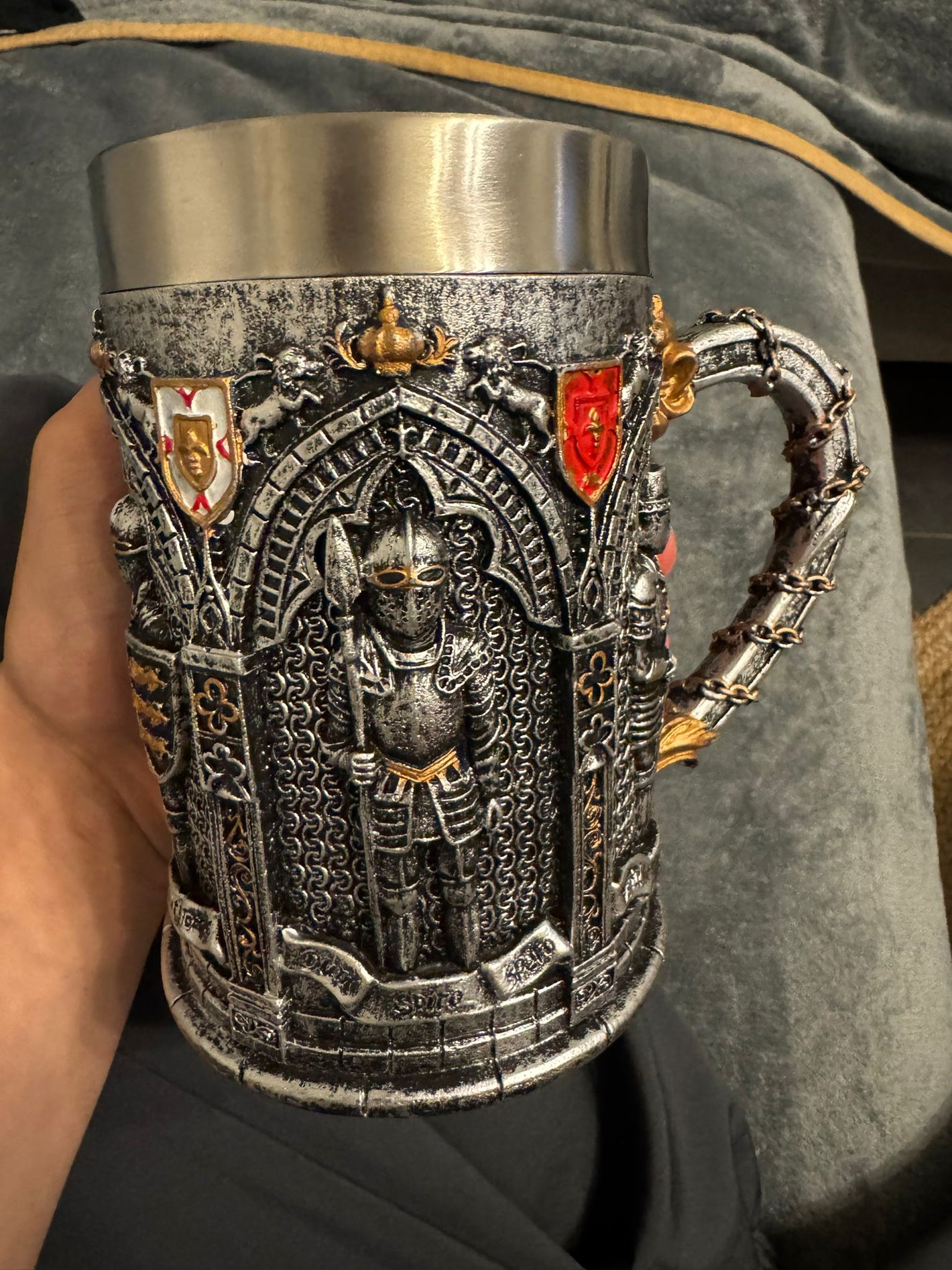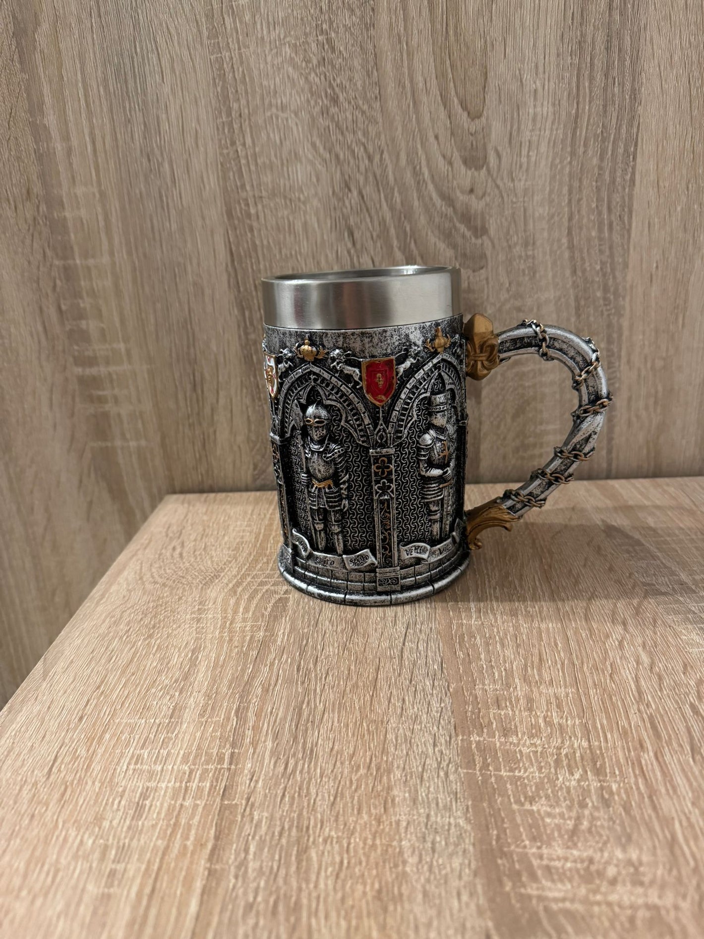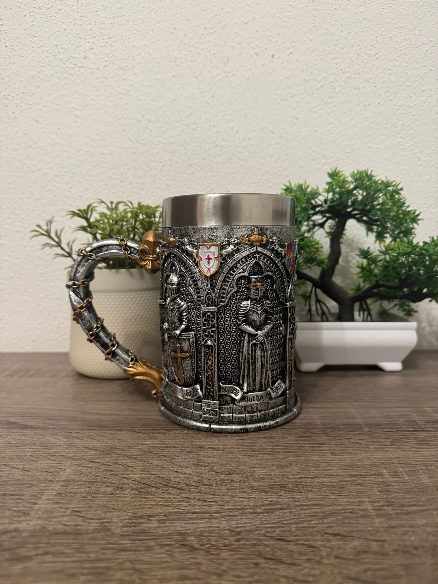 Stell dir vor, du trinkst aus einem Becher der aussieht wie aus einer Burg entnommen. Verziert mit Rüstungen, Wappen und feinen Details. Bringt er die Magie vergangener Zeiten zu dir nach Hause. Ein Sammlerstück, das Herz und Seele fesselt.
